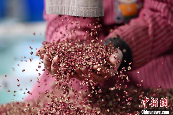 2024年3月17日,在甘肃省天水市甘谷县一加工企业内,工作人员检查初筛的花椒。(资料图)九美旦增 摄